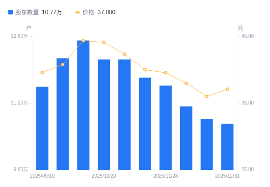 1月13日消息,数据显示,截至2026年1月9日,成飞集成A股股东总户数为11.12万户,较上期(2025年12月31日)增加3556户,增幅3.30%。公司最新A股总股本为3.59亿股,其中流通A股3.59亿股,户均持有流通A股数量为3225.4股,较上期减少106.53股,降幅3.20%;户均持流通A股市值13.09万元,较上期增加7338.75元,增幅5.94%。