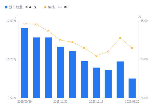 1月22日消息,数据显示,截至2026年1月20日,成飞集成A股股东总户数为10.41万户,较上期(2026年1月9日)减少7088户,降幅6.37%。公司最新A股总股本为3.59亿股,其中流通A股3.59亿股,户均持有流通A股数量为3444.95股,较上期增加219.54股,增幅6.81%;户均持流通A股市值13.09万元,较上期增加55.62元,增幅0.04%。