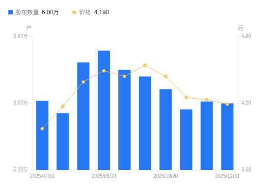 1月5日消息,数据显示,截至2025年12月31日,劲嘉股份A股股东总户数为6万户,较上期(2025年12月10日)减少229户,降幅0.38%。公司最新A股总股本为14.52亿股,其中流通A股14.41亿股,户均持有流通A股数量为2.4万股,较上期增加91.38股,增幅0.38%;户均持流通A股市值10.06万元,较上期减少574.31元,降幅0.57%。