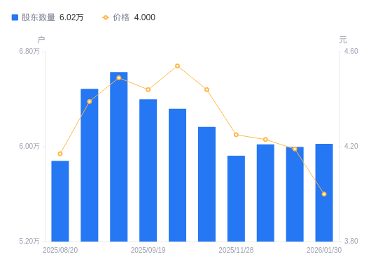 2月3日消息,数据显示,截至2026年1月30日,劲嘉股份A股股东总户数为6.02万户,较上期(2025年12月31日)增加260户,增幅0.43%。公司最新A股总股本为14.52亿股,其中流通A股14.41亿股,户均持有流通A股数量为2.39万股,较上期减少103.7股,降幅0.43%;户均持流通A股市值9.57万元,较上期减少4978.86元,降幅4.95%。