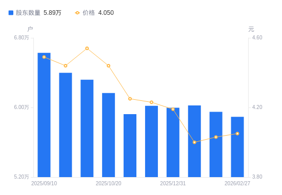 近一年(2025年2月28日至2026年2月27日),劲嘉股份A股股东户数从6.21万户,减低至5.89万户,降幅5.16%,区间股价下跌2.17%。