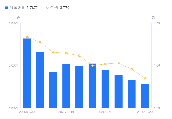 近一年(2025年3月20日至2026年3月20日),劲嘉股份A股股东户数从6.21万户,减低至5.78万户,降幅6.93%,区间股价下跌1.82%。