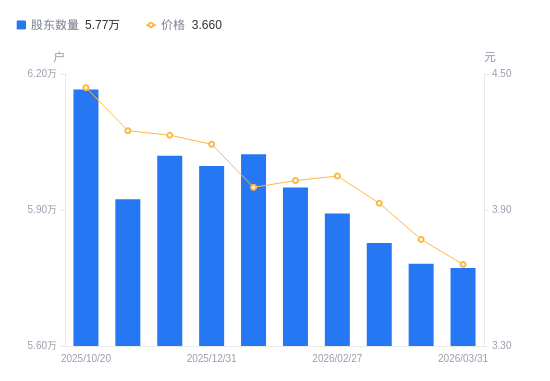 4月2日消息,数据显示,截至2026年3月31日,劲嘉股份A股股东总户数为5.77万户,较上期(2026年3月20日)减少93户,降幅0.16%。公司最新A股总股本为14.52亿股,其中流通A股14.41亿股,户均持有流通A股数量为2.5万股,较上期增加40.15股,增幅0.16%;户均持流通A股市值9.13万元,较上期减少2593.87元,降幅2.76%。