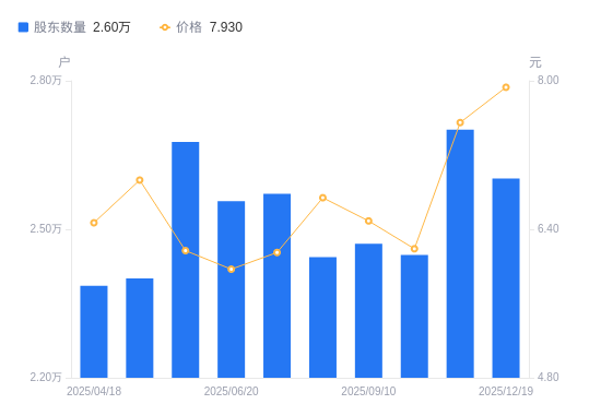 近一年(2024年12月20日至2025年12月19日),嘉应制药A股股东户数从2.3万户,增加至2.6万户,增幅13.20%,区间股价上涨7.89%。