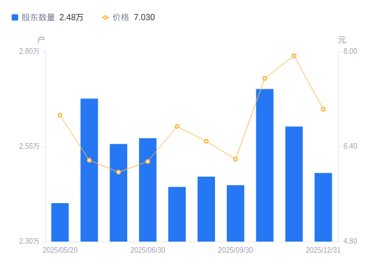 1月5日消息,数据显示,截至2025年12月31日,嘉应制药A股股东总户数为2.48万户,较上期(2025年12月19日)减少1221户,降幅4.69%。公司最新A股总股本为5.08亿股,其中流通A股5.07亿股,户均持有流通A股数量为2.05万股,较上期增加959.74股,增幅4.92%;户均持流通A股市值14.38万元,较上期减少1.08万元,降幅6.99%。