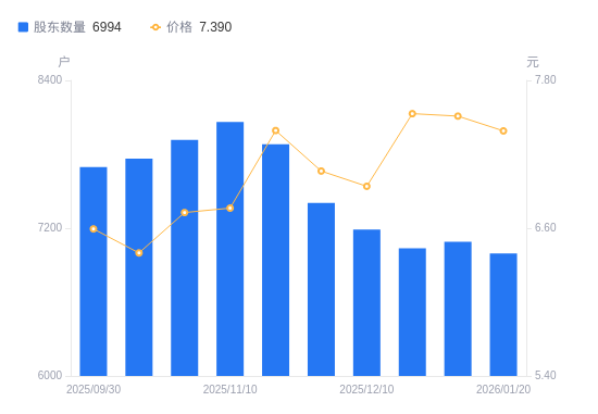 近一年(2025年1月20日至2026年1月20日),*ST交投A股股东户数从7287户,减低至6994户,降幅4.02%,区间股价上涨57.40%。