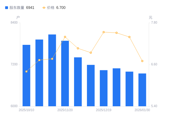 近一年(2025年2月10日至2026年1月30日),*ST交投A股股东户数从7264户,减低至6941户,降幅4.45%,区间股价上涨44.09%。