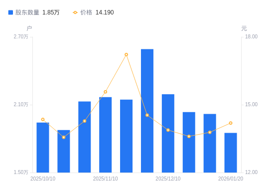 近一年(2025年1月20日至2026年1月20日),国统股份A股股东户数从2.18万户,减低至1.85万户,降幅15.27%,区间股价上涨71.38%。