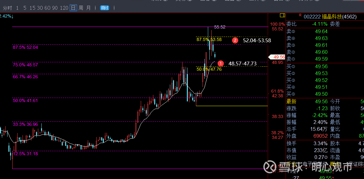 短期回落往白线靠,结合百分比显示,当前支撑48.57-47.76,这个区间不破就还是良性回撤,反压先看52.04、53.58