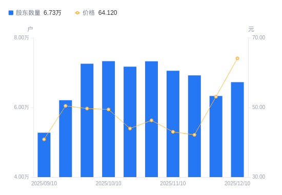 近一年(2024年12月10日至2025年12月10日),福晶科技A股股东户数从6.98万户,减低至6.73万户,降幅3.64%,区间股价上涨94.89%。
