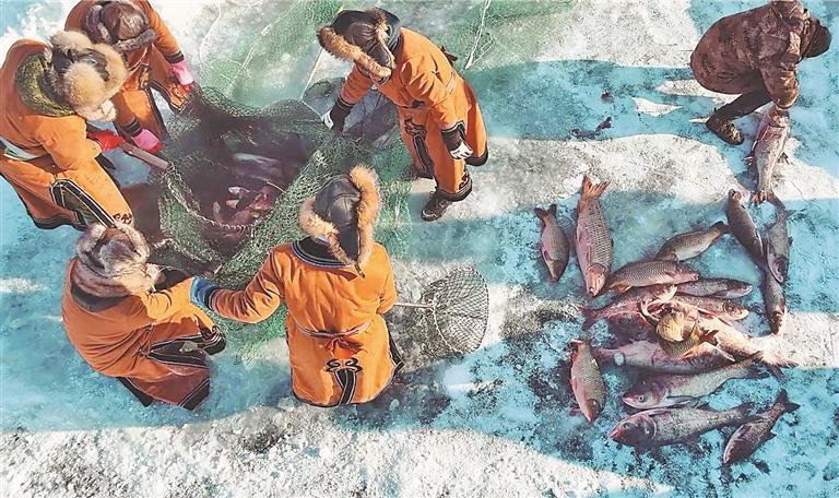 冬捕现场,鄂伦春族渔工身着厚重的防寒服,手持传承千年的捕鱼工具,在冰面上有条不紊地进行祈愿、醒网等传统仪式。“起网喽!”随着一声雄浑的渔号响起,渔工们齐心协力拉动巨网,冰层下的黑龙江特色冷水鱼早已跃跃欲试。当渔网缓缓出水,花鲢、白鲢、鲤鱼等鲜鱼翻腾跳跃,银鳞闪烁着冰晶的光泽,“万尾鲜鱼出玉门,冰湖腾鱼映丰年”的景象引得大家阵阵惊呼,纷纷举起手机记录这精彩瞬间。“第一次参加这样的活动,看着活蹦乱跳的大鱼从冰面下拉出来,挺震撼的,非常难忘。”俄罗斯游客拉维佳说。