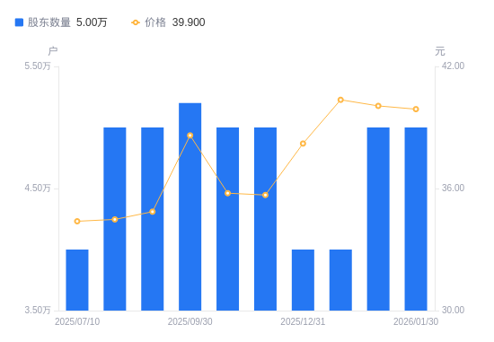 近一年(2025年2月20日至2026年1月30日),鱼跃医疗A股股东户数从4万户,增加至5万户,增幅25.00%,区间股价上涨6.68%。