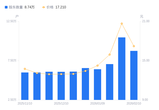 2月12日消息,数据显示,截至2026年2月10日,恒邦股份A股股东总户数为8.74万户,较上期(2026年1月30日)减少1.72万户,降幅16.43%。公司最新A股总股本为14.3亿股,其中流通A股11.92亿股,户均持有流通A股数量为1.36万股,较上期增加2241.03股,增幅19.66%;户均持流通A股市值23.48万元,较上期减少766.98元,降幅0.33%。