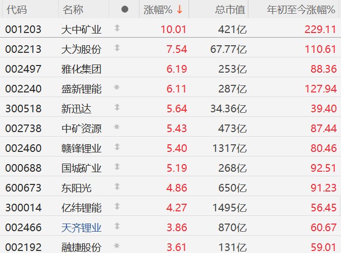 格隆汇12月8日|A股市场锂矿股走强,其中,大中矿业10CM涨停,大为股份涨超7%,雅化集团、盛新锂能涨超6%,新迅达、中矿资源、赣锋锂业、国城矿业涨超5%,东阳光、亿纬锂能涨超4%,天齐锂业、融捷股份涨超3%。