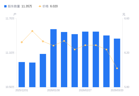 近一年(2025年3月31日至2026年3月31日),上海莱士A股股东户数从10.74万户,增加至11.36万户,增幅5.73%,区间股价下跌15.92%。