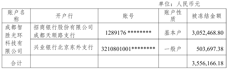 被冻结的原因是智胜光环公司与河南万聚达科技发展有限公司签订的销售合同中,因供应商中科凯捷未按合同履行交货义务,导致公司无法按期交付合同标的,河南万聚达因此提起诉讼并申请财产保全措施。
