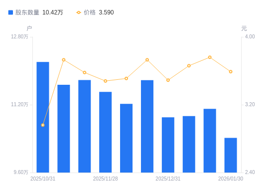近一年(2025年2月10日至2026年1月30日),兆新股份A股股东户数从11.23万户,减低至10.42万户,降幅7.20%,区间股价上涨43.60%。