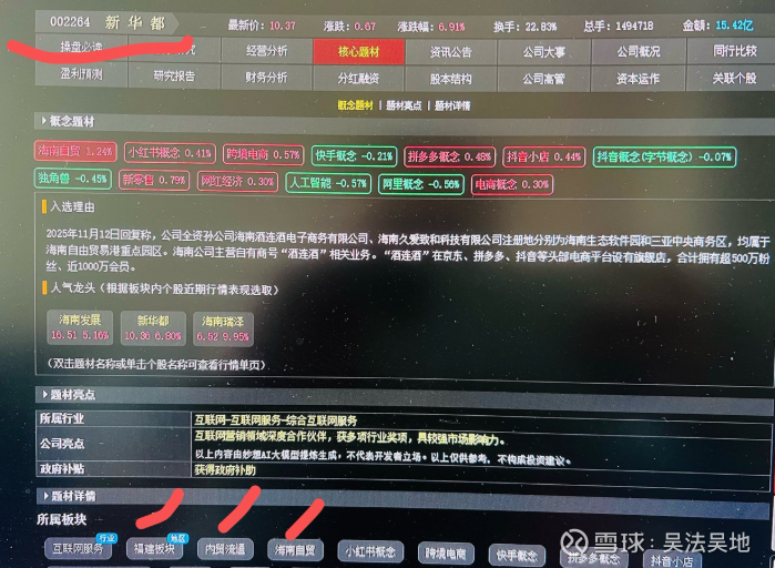 目前的业务核心是互联网营销(特别是酒类电商),因此它的概念属性非常丰富,主要围绕电商、数字经济、人工智能以及区域政策展开。 根据最新的公司公告和市场数据,整理了新华都的完整概念图谱: 1. 核心业务概念...