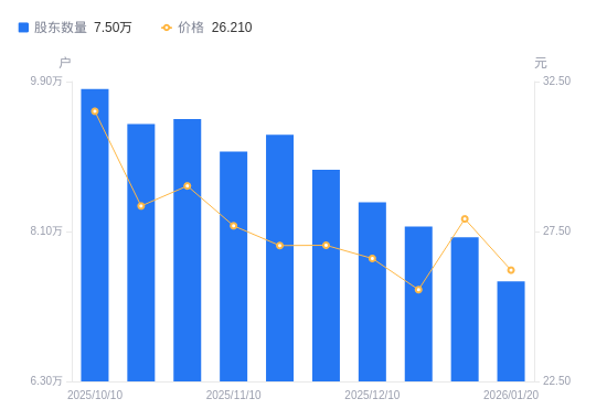 近一年(2025年2月10日至2026年1月20日),建设工业A股股东户数从11.22万户,减低至7.5万户,降幅33.16%,区间股价下跌8.29%。