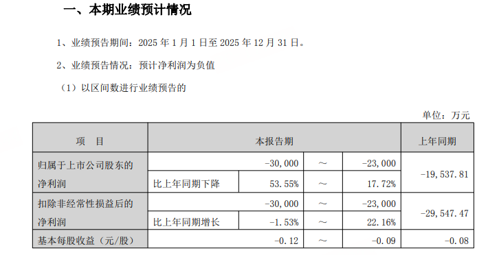 1月30日,美邦服饰发布业绩预告,预计2025年全年净亏损2.3亿元至3亿元,较上年同期下降17.72%至53.55%。扣除非经常性损益后的净利润同样为-3亿元至-2.3亿元。基本每股收益为-0.12元至-0.09元。