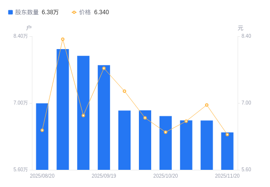 近一年(2024年11月20日至2025年11月20日),友阿股份A股股东户数从5.54万户,增加至6.38万户,增幅15.24%,区间股价上涨75.38%。