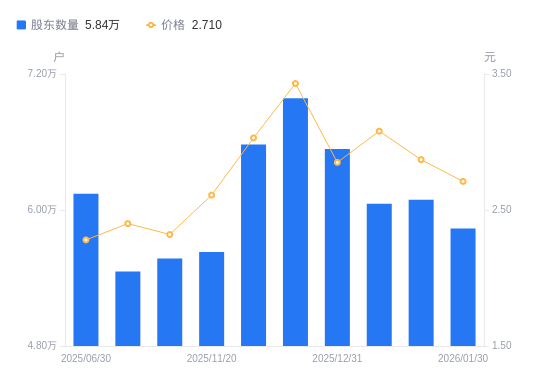 近一年(2025年3月31日至2026年1月30日),世联行A股股东户数从6.37万户,减低至5.84万户,降幅8.30%,区间股价上涨13.87%。