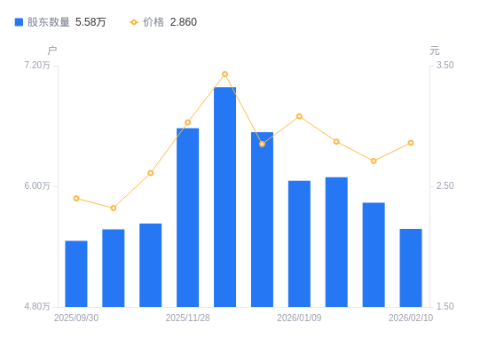 近一年(2025年3月31日至2026年2月10日),世联行A股股东户数从6.37万户,减低至5.58万户,降幅12.41%,区间股价上涨20.17%。