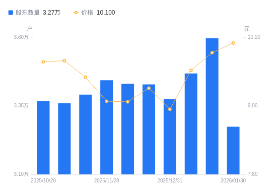 近一年(2025年2月10日至2026年1月30日),保龄宝A股股东户数从3.07万户,增加至3.27万户,增幅6.71%,区间股价上涨31.34%。