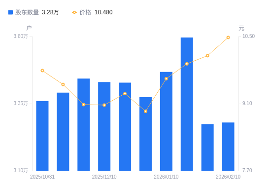 2月11日消息,数据显示,截至2026年2月10日,保龄宝A股股东总户数为3.28万户,较上期(2026年1月30日)增加60户,增幅0.18%。公司最新A股总股本为3.81亿股,其中流通A股3.7亿股,户均持有流通A股数量为1.13万股,较上期减少20.65股,降幅0.18%;户均持流通A股市值11.81万元,较上期增加4072.97元,增幅3.57%。