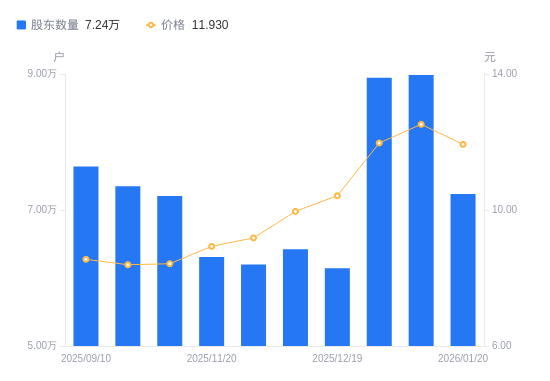 近一年(2025年1月27日至2026年1月20日),博云新材A股股东户数从4.99万户,增加至7.24万户,增幅44.95%,区间股价上涨89.67%。