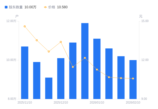 2月12日消息,数据显示,截至2026年2月10日,海峡股份A股股东总户数为10万户,较上期(2026年1月31日)减少2000户,降幅1.96%。公司最新A股总股本为22.35亿股,其中流通A股22.35亿股,户均持有流通A股数量为2.23万股,较上期增加438.17股,增幅2.00%;户均持流通A股市值23.64万元,较上期增加3978.58元,增幅1.71%。