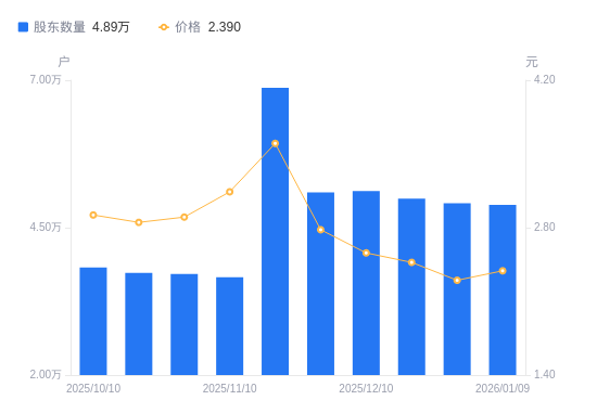 1月12日消息,数据显示,截至2026年1月9日,华英农业A股股东总户数为4.89万户,较上期(2025年12月31日)减少270户,降幅0.55%。公司最新A股总股本为21.33亿股,其中流通A股21.24亿股,户均持有流通A股数量为4.35万股,较上期增加238.92股,增幅0.55%;户均持流通A股市值10.39万元,较上期增加4462.32元,增幅4.49%。