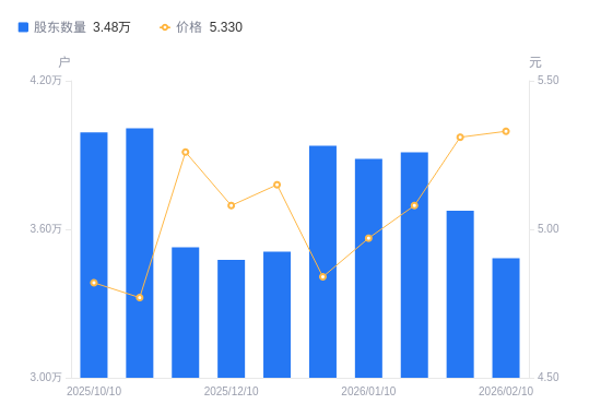 近一年(2025年2月28日至2026年2月10日),得利斯A股股东户数从3.97万户,减低至3.48万户,降幅12.16%,区间股价上涨20.05%。