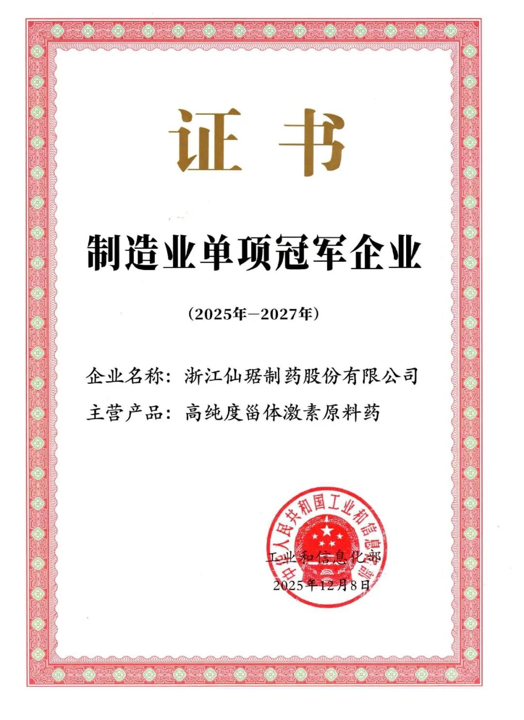 近日,国家工业和信息化部公布制造业单项冠军企业名单,浙江仙琚制药(002332)股份有限公司凭借在甾体药物领域的绝对领先优势,荣耀登榜!这一国家级认定奠定了其在全球细分市场的领军地位。