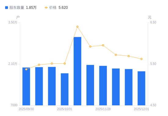 1月5日消息,数据显示,截至2025年12月31日,罗普斯金A股股东总户数为1.85万户,较上期(2025年12月19日)减少777户,降幅4.03%。公司最新A股总股本为6.75亿股,其中流通A股6.53亿股,户均持有流通A股数量为3.53万股,较上期增加1422.38股,增幅4.20%;户均持流通A股市值19.83万元,较上期增加5623.66元,增幅2.92%。