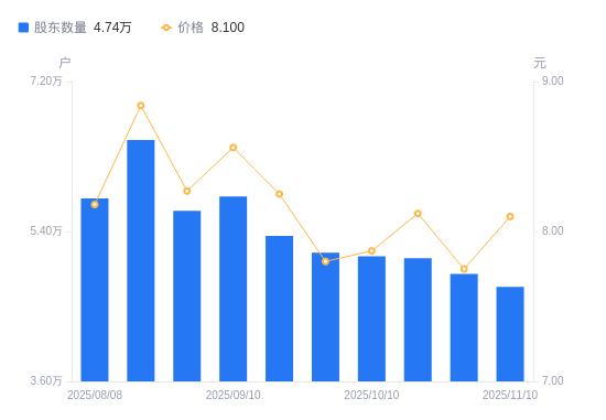 11月11日消息,数据显示,截至2025年11月10日,慈文传媒A股股东总户数为4.74万户,较上期(2025年10月31日)减少1537户,降幅3.14%。公司最新A股总股本为4.74亿股,其中流通A股4.74亿股,户均持有流通A股数量为1万股,较上期增加314.37股,增幅3.25%;户均持流通A股市值8.1万元,较上期增加5936.92元,增幅7.91%。