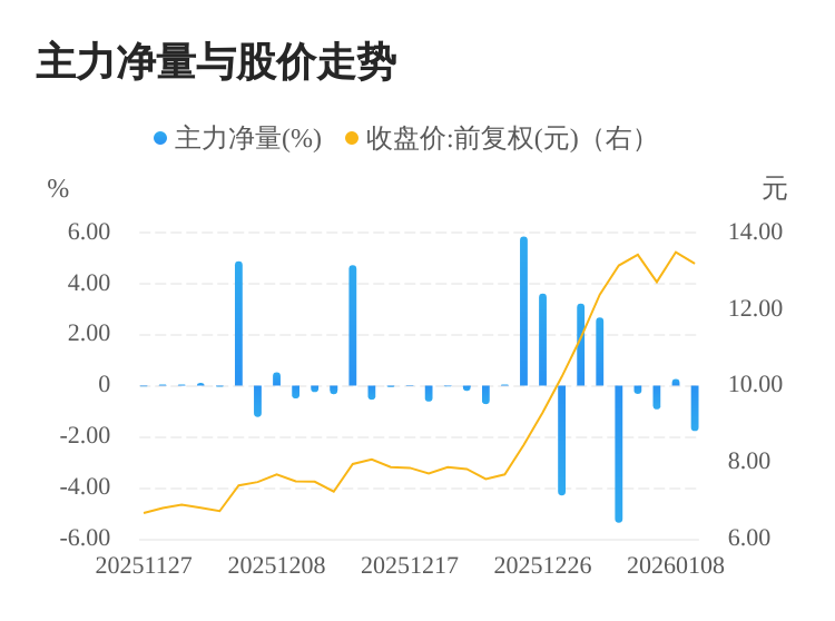 泰尔股份(002347)01月08日主力(dde大单净额)净流出2076.75万元,涨跌幅为6.14%,主力净量(dde大单净额/流通股)为0.26%,两市排名601/5183。
