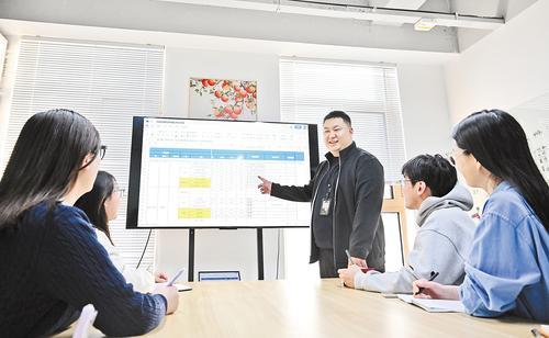 2月4日,谷聪(右三)在河北顺丰速运有限公司总部的一间会议室与同事交流工作。本报记者 史晟全摄□本报记者 高珊