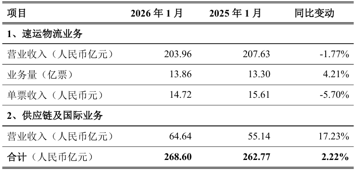 2月13日,顺丰控股(002352/06936)发布公告,2026年1月快递物流业务经营简报显示,公司2026年1月速运物流业务及供应链和国际业务合计收入为268.6亿元,同比增长2.22%。