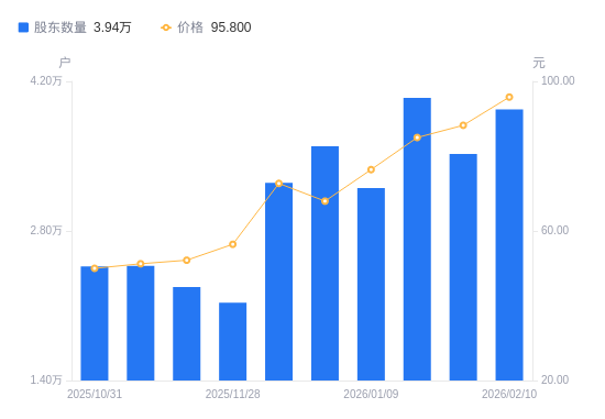 近一年(2025年2月10日至2026年2月10日),杰瑞股份A股股东户数从2.4万户,增加至3.94万户,增幅63.78%,区间股价上涨155.06%。