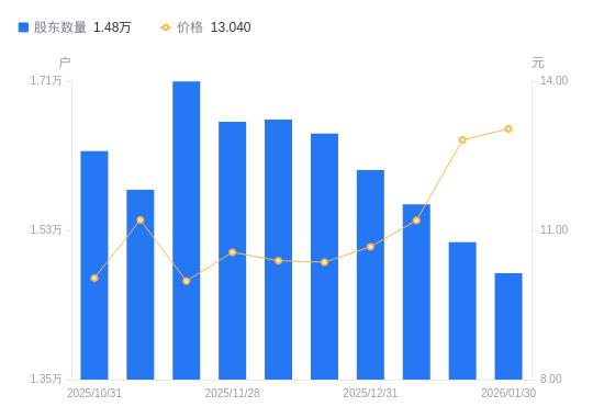 近一年(2025年2月10日至2026年1月30日),富临运业A股股东户数从1.63万户,减低至1.48万户,降幅9.07%,区间股价上涨76.22%。
