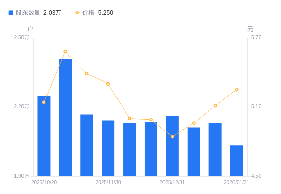 近一年(2025年2月28日至2026年1月31日),同德化工A股股东户数从1.72万户,增加至2.03万户,增幅17.97%,区间股价上涨2.34%。