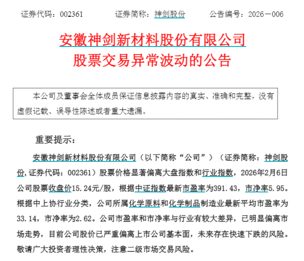 商业航天“大牛股”神剑股份(002361)(002361)于2月8日晚间发布股票交易异常波动公告。公司指出,当前市场对其商业航天业务关注度较高,公司航空航天类产品主要包括飞机雷达罩、卫星复合材料零部件、地面接收装置等。但根据财务数据,2025年第三季度公司营业总收入18.34亿元中,航空航天类业务收入仅为1.39亿元,占比约7.59%。