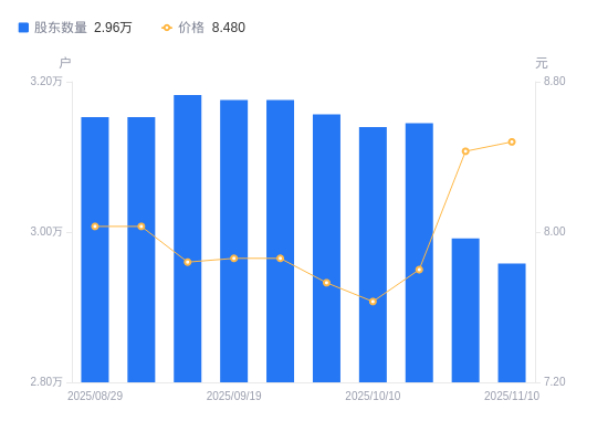 11月12日消息,数据显示,截至2025年11月10日,隆基机械A股股东总户数为2.96万户,较上期(2025年10月31日)减少335户,降幅1.12%。公司最新A股总股本为4.17亿股,其中流通A股4.16亿股,户均持有流通A股数量为1.41万股,较上期增加157.4股,增幅1.13%;户均持流通A股市值11.92万元,较上期增加2029.63元,增幅1.73%。