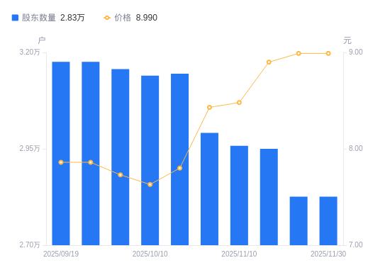 近一年(2024年11月30日至2025年11月30日),隆基机械A股股东户数从3.47万户,减低至2.83万户,降幅18.62%,区间股价上涨30.48%。