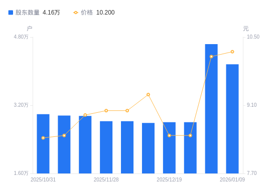 1月21日消息,数据显示,截至2026年1月20日,隆基机械A股股东总户数为3.84万户,较上期(2026年1月9日)减少3195户,降幅7.68%。公司最新A股总股本为4.17亿股,其中流通A股4.16亿股,户均持有流通A股数量为1.08万股,较上期增加831.06股,增幅8.32%;户均持流通A股市值10.5万元,较上期增加3065.32元,增幅3.01%。