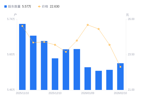 2月12日消息,数据显示,截至2026年2月10日,太极股份A股股东总户数为5.57万户,较上期(2026年1月30日)增加264户,增幅0.48%。公司最新A股总股本为6.23亿股,其中流通A股6.2亿股,户均持有流通A股数量为1.11万股,较上期减少53.12股,降幅0.47%;户均持流通A股市值25.23万元,较上期减少1.87万元,降幅6.89%。