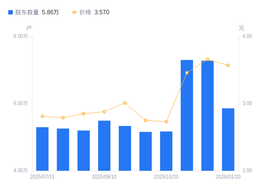 近一年(2025年1月20日至2026年1月20日),中锐股份A股股东户数从5.6万户,增加至5.86万户,增幅4.65%,区间股价上涨36.78%。