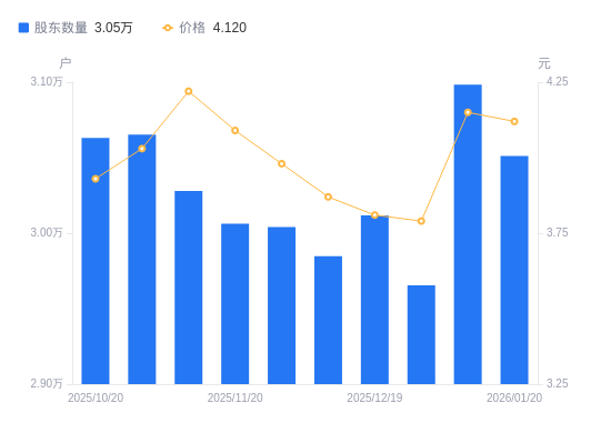 近一年(2025年1月20日至2026年1月20日),亚厦股份A股股东户数从3.58万户,减低至3.05万户,降幅14.68%,区间股价上涨12.20%。