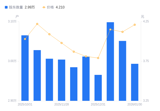 近一年(2025年2月28日至2026年1月30日),亚厦股份A股股东户数从3.44万户,减低至2.99万户,降幅12.86%,区间股价上涨8.17%。